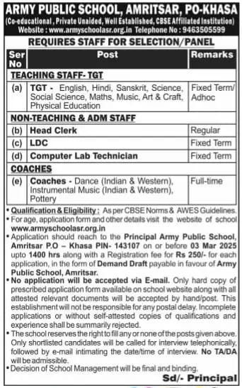 - Application should reach to the Principal Army Public School,Amritsar P.O – Khasa PIN – 143107 before 03 March 2025.