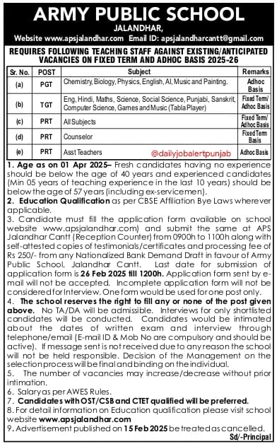 The Last date to apply for APS Jalandhar Teaching Posts is 26 Feb 2025 and 05 March 2025 For Non Teaching Posts.