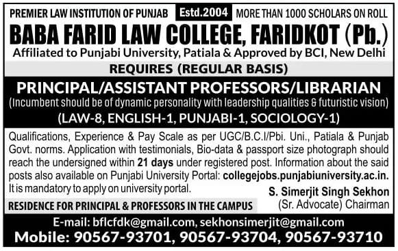 Baba Farid Law College Faridkot Jobs 2025 Education Qualifications