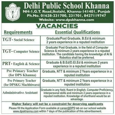 Online applications are invited by Delhi Public School Khanna. Interested candidates Can Apply for DPS Khanna Recruitment 2025 of various teaching Posts. This Recruitment includes various posts like TGT, PRT, Pre-Primary and Administrative Assistant. Apply through the Official Website dpskhanna.com . Apply Offline For Delhi Public School Khanna Jobs 2025 Notification.