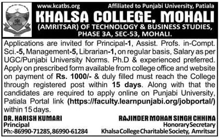Khalsa College Sahibzada Ajit Singh Nagar Post Details