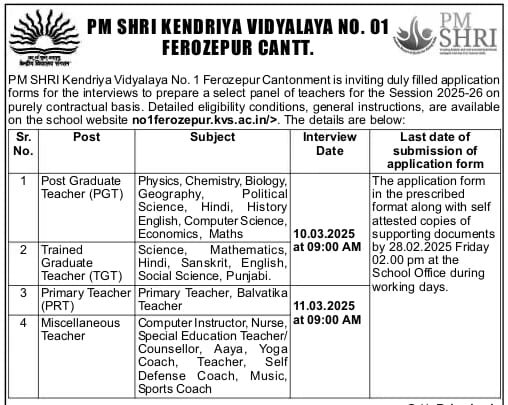Online applications are invited by PM Shri Kendriya Vidyalaya No.1 Ferozepur Cantt. Interested candidates Can Apply for KVS Ferozepur Recruitment 2025 of various teaching and non teaching Posts. Through the Official Website no1ferozepur.kvs.ac.in . Apply Offline For PM Shri Kendriya Vidyalaya No.1 Ferozepur Jobs 2025 Notification.
