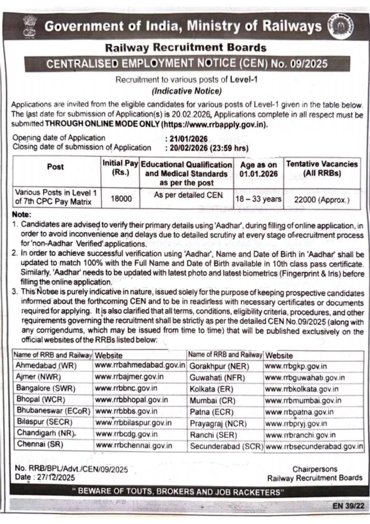 RRB Group D Recruitment 2026 Notification out for 22000 Posts